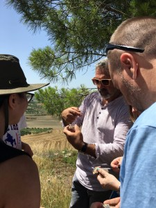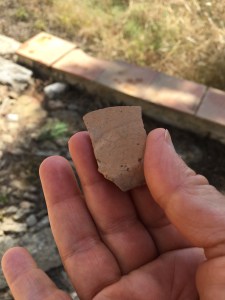 We’ve had a jam-packed first day. We spent the morning on a three-hour, hot hot hike to the top of a hill, which was strewn with thousands of shards of Ancient Greek and Roman pottery. My “find” turned out to be an uninteresting piece of 200 BCE kitchen crockery, but others found beautiful pieces of decorative pottery from centuries before that.