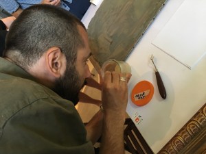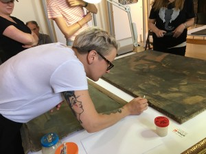 We spent the morning learning more about the techniques of evaluating and restoring old paintings, using 400 year-old paintings that had been found rolled up in closets, stashed in basements, moldy, creased, torn. It appears to me that the main techniques involve rolling hand-made special Q-tips soaked in solution across the painting, quarter inch by quarter inch.