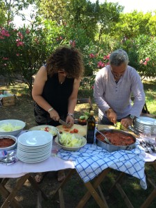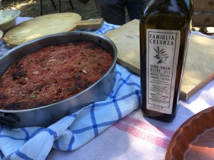 Not in Italy, however. Today, the entire group headed out for an overnight field trip to Pompeii and Naples. What did we do at lunchtime? Tonio brought out tables and table cloths, real plates and silverware, homemade eggplant parmigiana, his own branded olive oil from his family’s farm, and biscotti.
