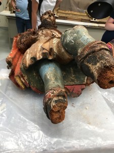 My favorite was a statue of St. Rocco, which was being treated with the million little injections of chemicals to fight its extensive termite damage. A decision has been made to not replace the missing feet, but to leave as is.