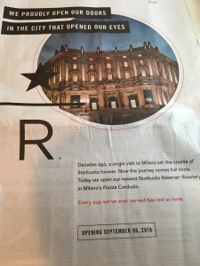 I opened the New York Times on Wednesday, to see a full-page announcement from Starbucks that they were opening a shop in Milan. This first is a special “Roastery” shop, to be followed by four regular, Frappuccino-serving stores in the near future. As the ad suggests, Howard Schultz, Starbucks’ founder, was in a cafe in Milan in 1983 when he was inspired to start the chain. According to this article in the Times, on the first day of the new Milan Starbucks, there was an hour-long line to get in.