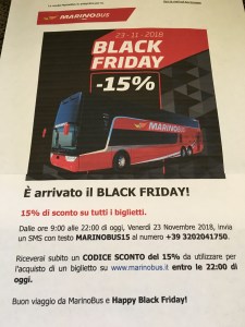 This morning, I was puzzled again to receive an emailed ad from an Italian bus company for Black Friday discounts on tickets. (I get these bus ads because I bought tickets on line for a journey from Naples to Puglia.) “Black Friday has arrived!” reads the ad. “Fifteen percent discount on all tickets.” “Have a good trip on MarinoBus and Happy Black Friday!”
