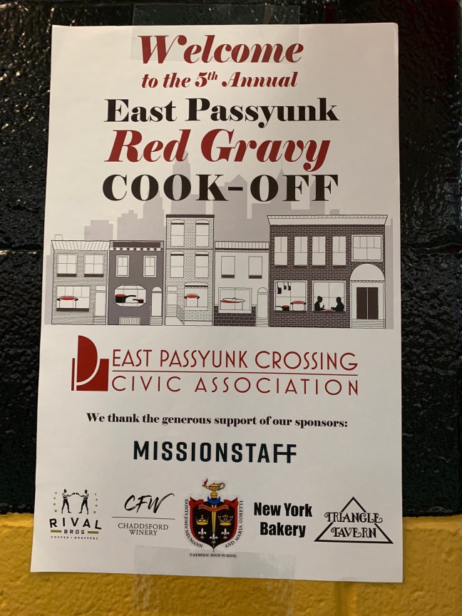 I saw a sign a few weeks ago in a South Philly bakery for an upcoming Red Gravy Cook-Off to benefit the East Passyunk Community Organization. “We’re in,” I said to Ben, my good sport husband. And sure enough, two weeks later, we were there, with our friends Nanette and Rick.