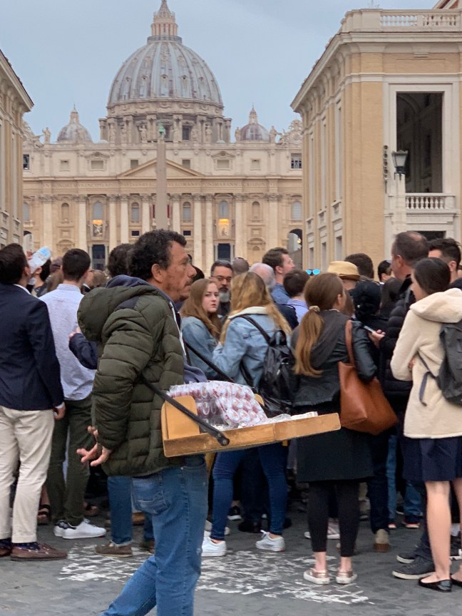 But even at dawn, I had the city to myself. Except for the people already lining up for Easter mass at the Vatican, and the vendors hawking “Cheap rosaries, blessed by Pope.”