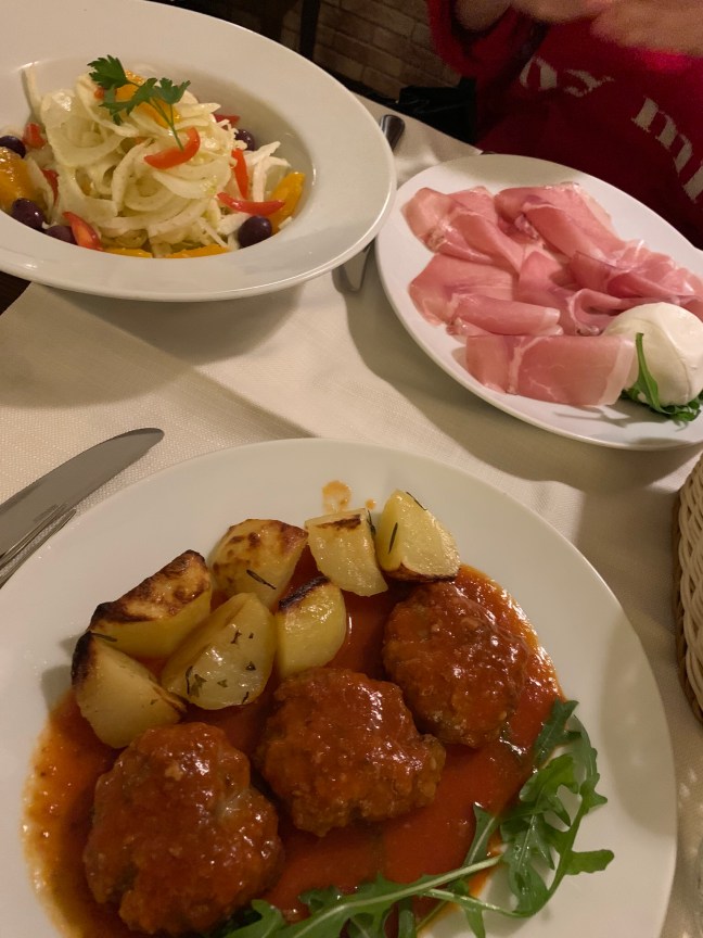 And we had fantastic, creative meals, with fresh seasonal ingredients and distinctive flavors, not the spaghetti and meatballs one might imagine. In fact, one can’t even get spaghetti and meatballs in Italy, as their idea is that the pasta course, the primo, should come before the meat course, the secondo, not plopped one on top of the other.