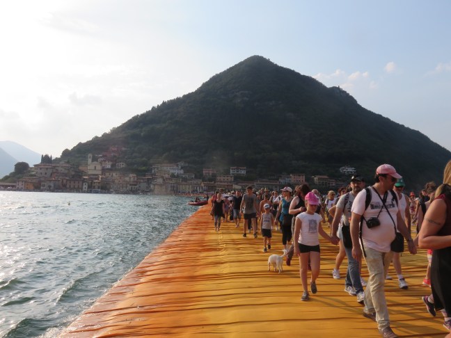 The Floating Piers was a nearly two-mile-long, saffron-colored, fabric-on-polyethylene- cube walkway on the lake, extending out to and around an island.