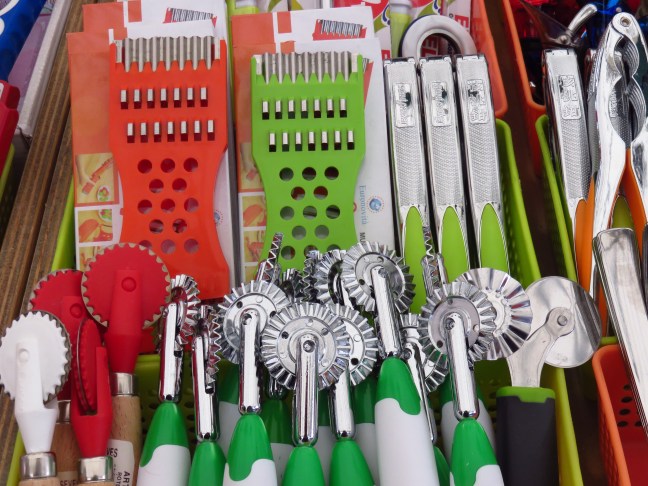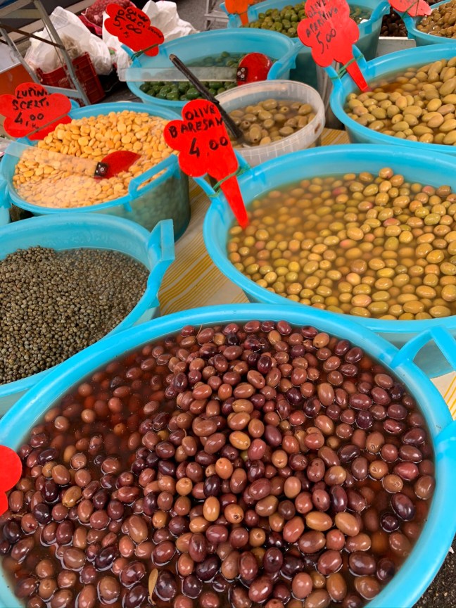 I always make a point to seek out the weekly outdoor markets that take place in most Italian towns of any size. We took time away from our olive-picking duties one Saturday morning to go to Altamura’s. I love the variety and predictability of the offerings and the enthusiasm of the customers. Thankfully, I had committed myself to not checking any luggage; otherwise, I would have come home with an extra suitcase filled with items I probably don’t need. I did purchase a set of espresso spoons (2 euro!) that will remind me of Altamura’s market every time I use them. Here are some examples: