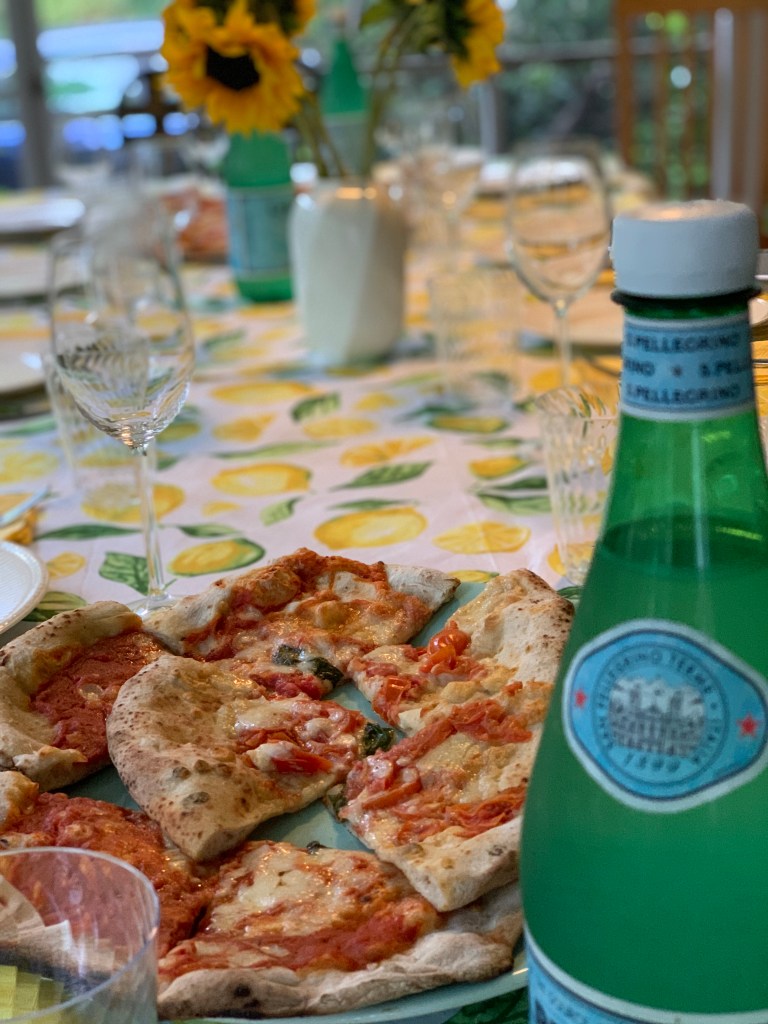 As a person who gives new meaning to “slapdash,” I was nonetheless determined to do this dinner Creanza-style. I resisted the urge towards paper plates and cups. I had a cloth and even flowers on the table. I confess to not actually cooking, but instead had Talia di Napoli pizza, which is made to order in Naples, frozen, and shipped on dry ice, which I think made it special enough to pass muster. And the other group members brought delicious salads, desserts, contorni and antipasti. So it was a group effort.