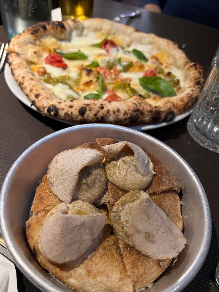 Last night, we headed to #8 Seu Pizza Illuminati in Roma, a bright, bustling place filled with families that could not be a greater contrast with Dry Milano. We tried a more traditional Amatriciana — basically a regular pizza with guanciale (Italian bacon) — and a “Greek Freak,” with feta, spinach and pumpkin, including pumpkin seeds. Both were extremely delicious: we kept going back and forth, deciding which pie was our favorite.
