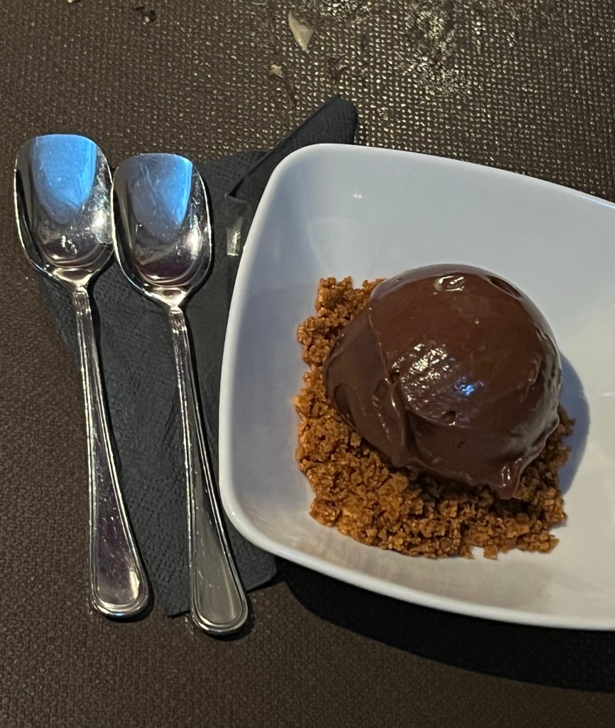 Our first stop was #18 Dry Milano in, of course, Milano. (The “dry” I can’t explain.) Very, very hip in decor and clientele, it offered some very inventive options along with the traditional. So we split the difference: a slightly spicy veggie Peperoncini, combined with a focaccia like you’ve never seen, topped by creamed tuna sauce and a thin slice of veal. I know that sounds a little weird to American ears, but I promise, it was fantastic. And Ben claims his chocolate sorbetto was the best he’d ever had in his whole, entire life.