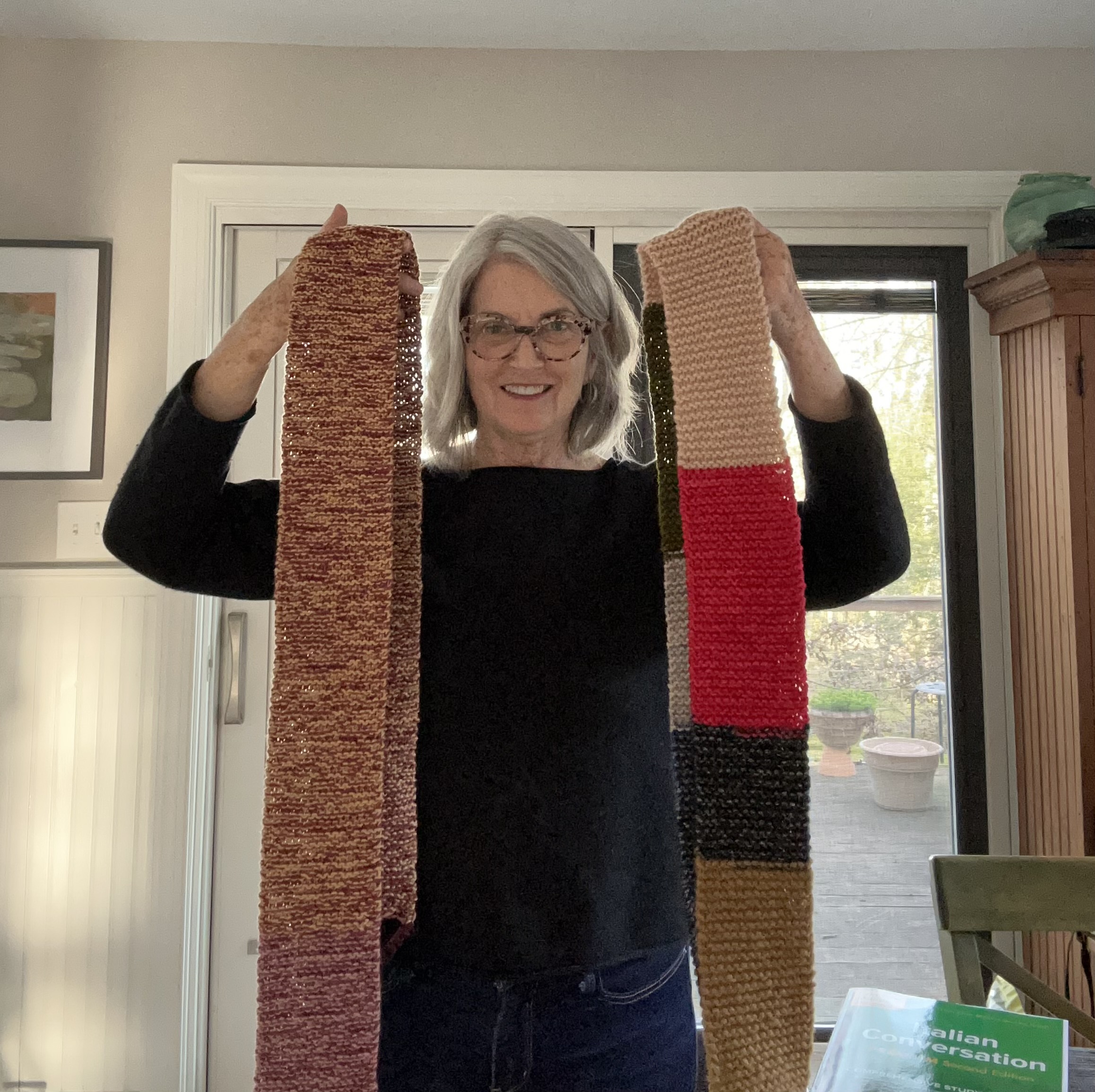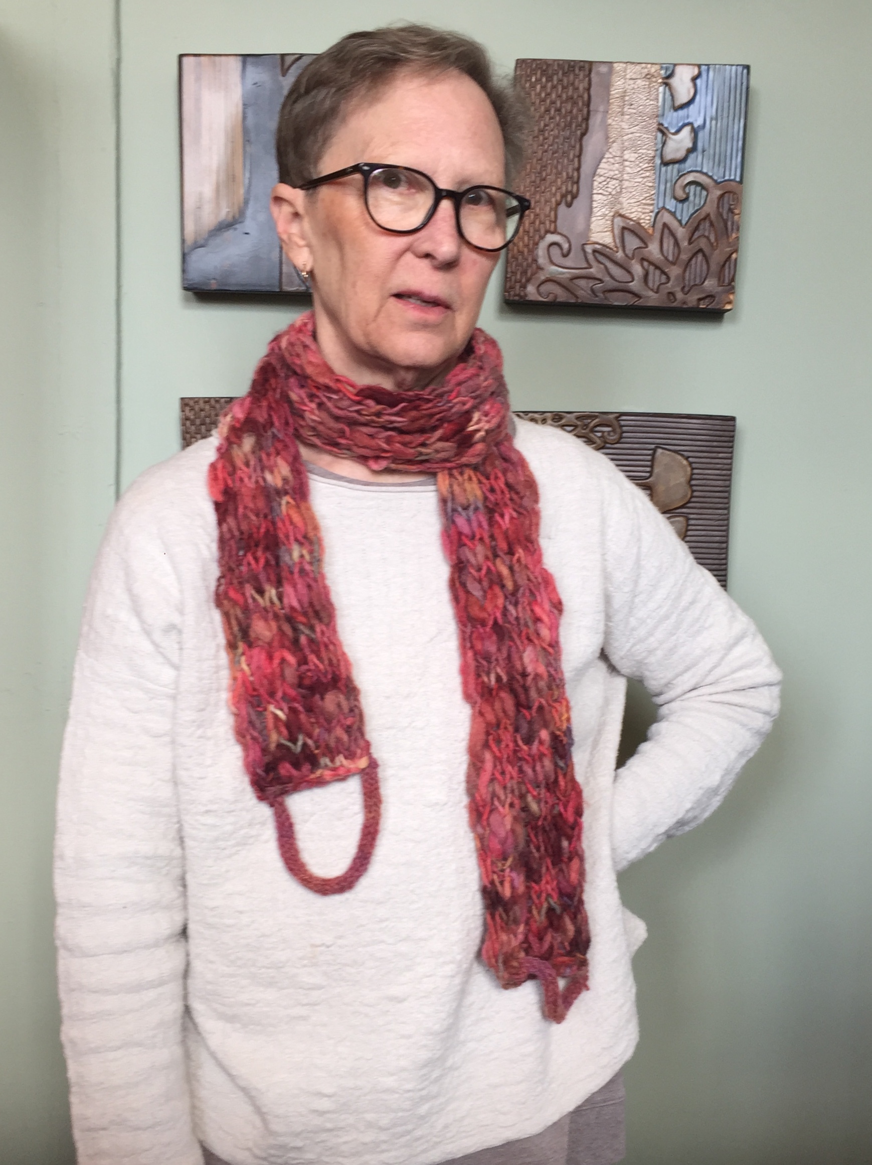 So I sent out the word to all the women I knew whom I thought would be willing and able, and sure enough, within two weeks I had a box of fifteen knitted scarves, all distinctive and creative, to ship out.