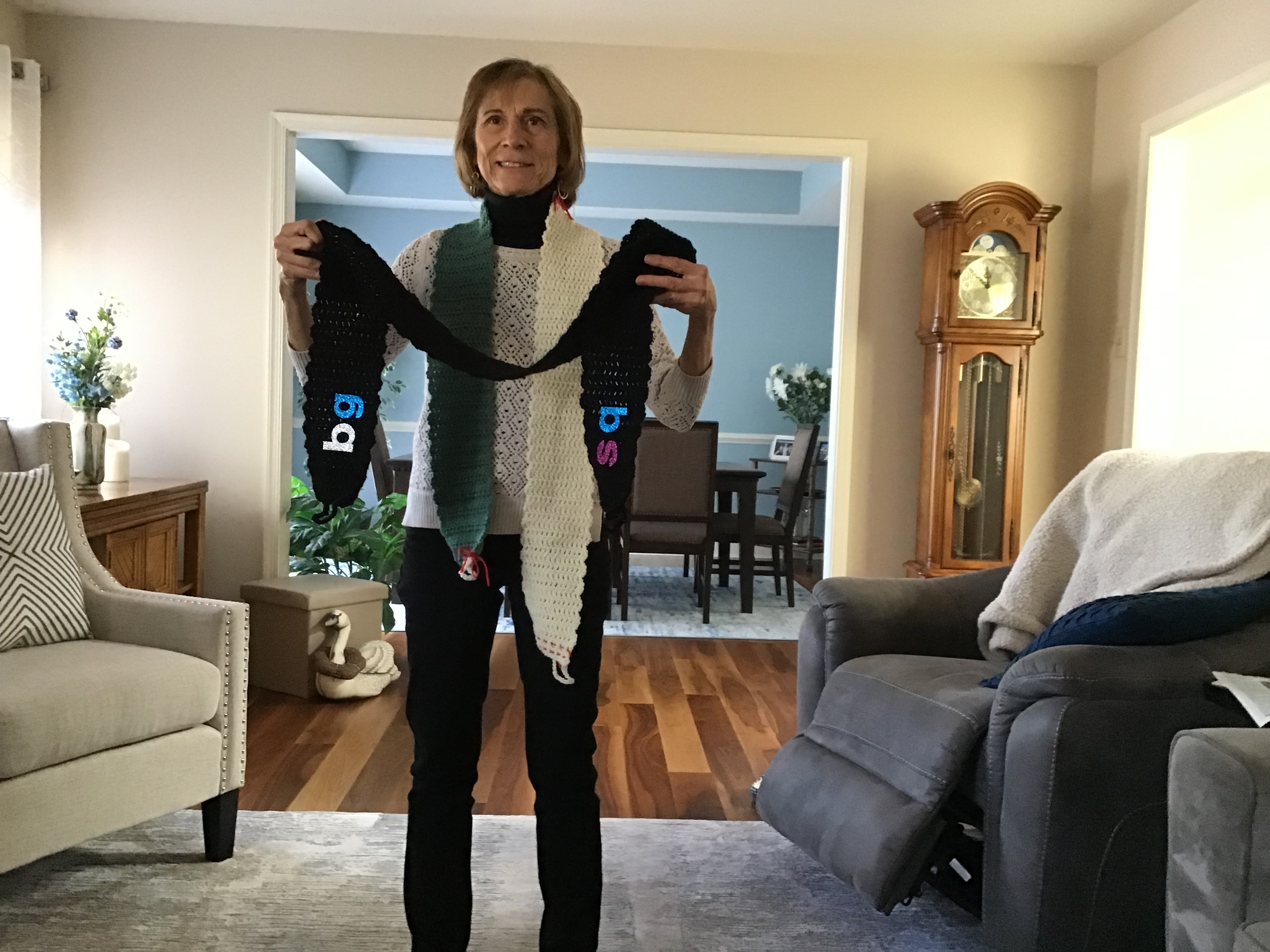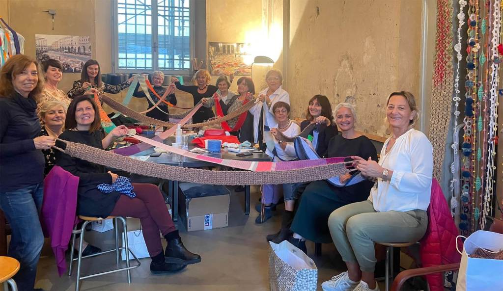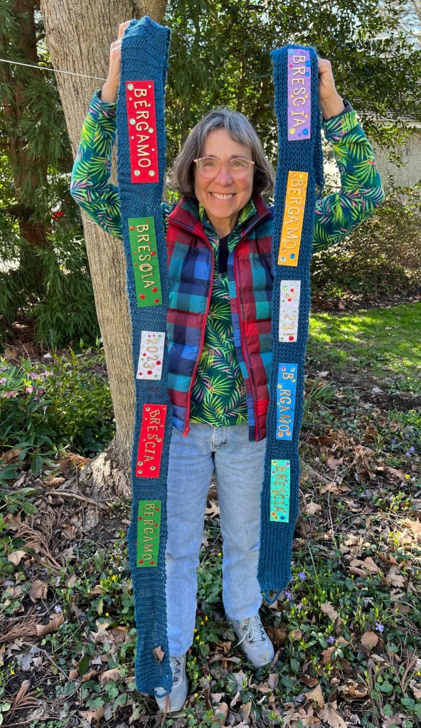 It would clearly take a load of scarves to connect people over a span of fifty miles. Community members of all ages got to work knitting and crocheting, in a modern version of quilting bees. And the call went out, far and wide: who can help us with this project? A notice went out from one of the Italian instructors at the America-Italy Society of Philadelphia, of which I am a member.
