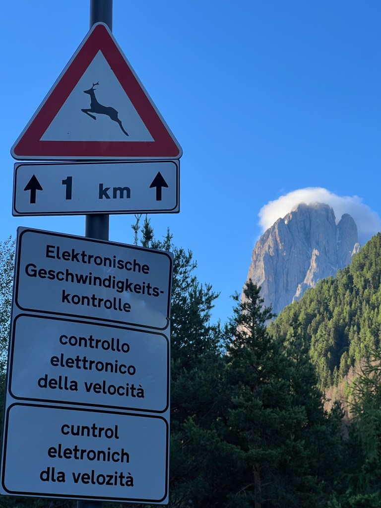 There were no Italian flags to be seen, even at the post office, and only about one-quarter of the inhabitants there are of Italian descent. One heard a reasonable amount of Italian on the street, but German is the first language of two-thirds of the inhabitants, with Ladino, an ancient Romance language spoken by 4%, and still taught in some schools and heard on special Ladino television networks. Having German, Ladino and Italian on all the signs pushes off English, forcing me to rely on my very spotty Italian to get around.