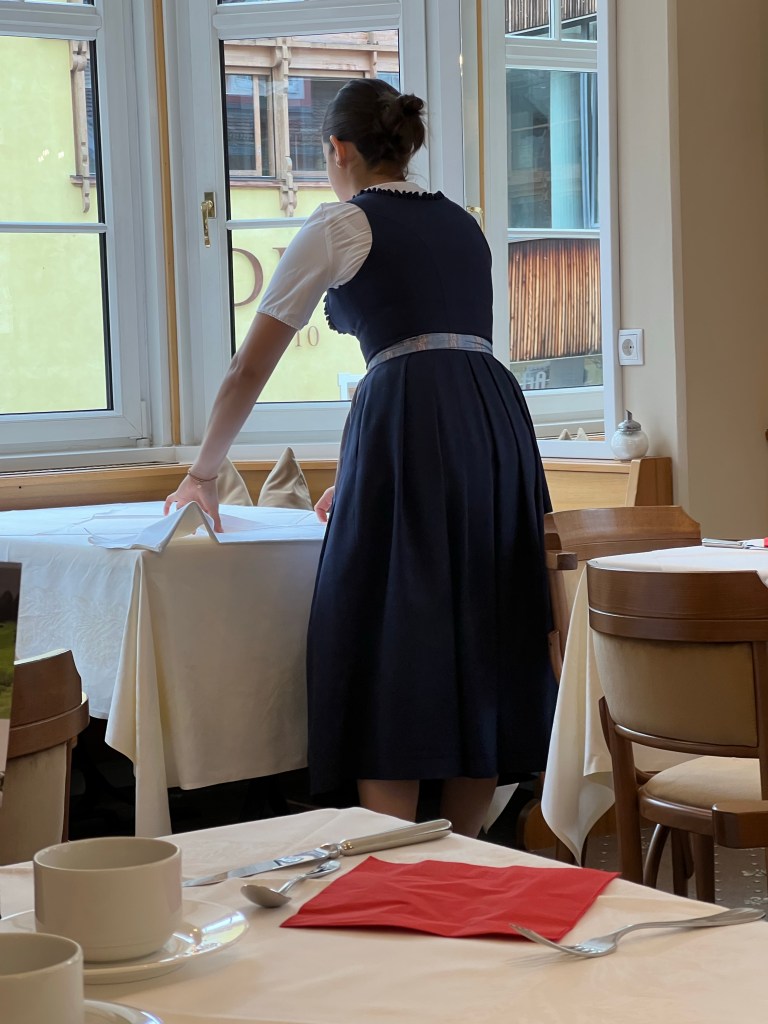 The waitstaff commonly wear Maria von Trapp-style uniforms