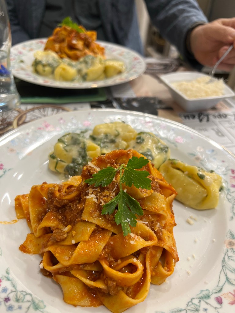 As we were staying in Bologna, our plans revolved around finding a local trattoria to have two of its local specialties: tagliatelle Bolognese and tortellini. We had lots of recommendations of places to try, and at a respectable time, we set off in search of one. What we did not count on, however, was that it was a Saturday night, the first balmy one of the season, and all the places we tried were “complete” or full. Of course in Italy, the implications of this are worse than America, because once a table is booked, it’s held for the entire evening. Turnover is not a thing here.