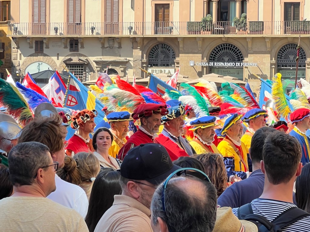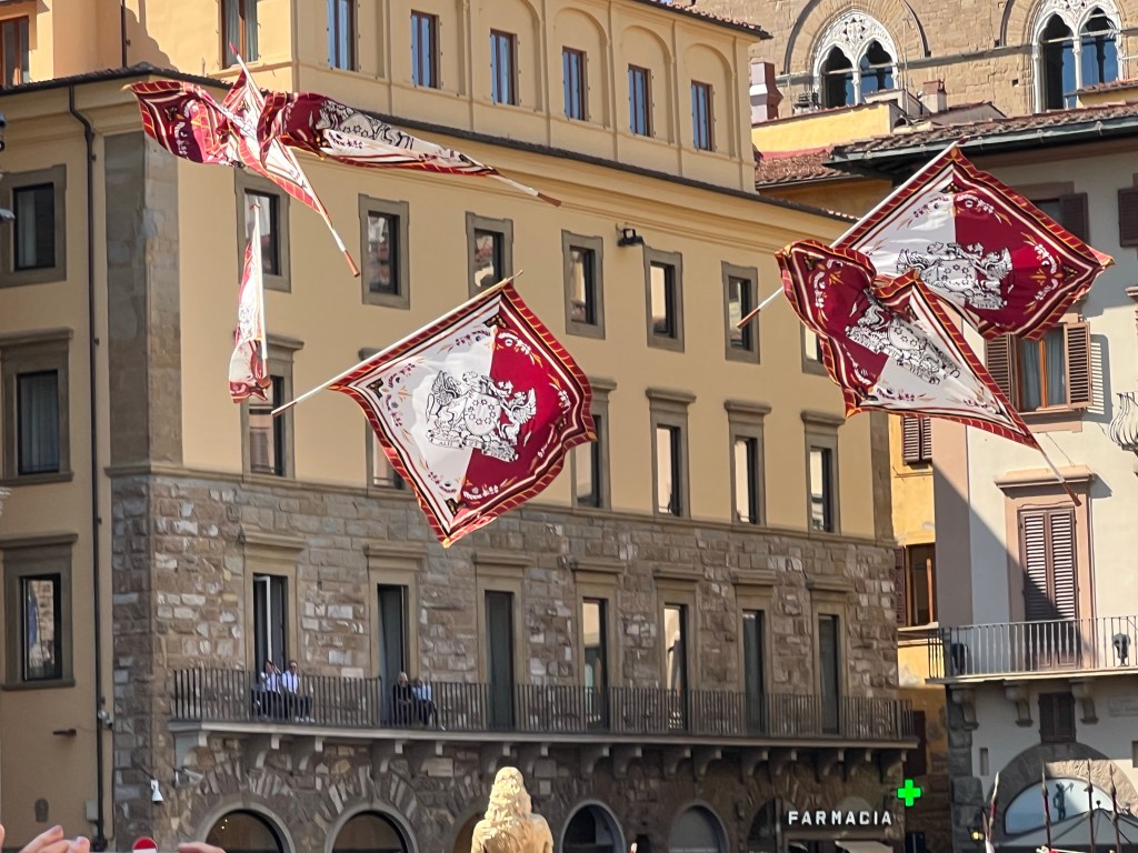 It turns out, in the main Piazza Signoria, there was a competition between teams that do traditional Tuscan flag-throwing. What a bonus to be able to watch these squads of sbandieratori, with the flags and uniforms that have represented their individual towns since the Middle Ages, go through their paces. I don’t know (or care) who won, but what a thing to see!