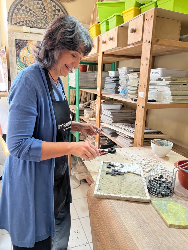 All the other students had a professional motivation to learn more about mosaics, either for artistic or commercial reasons. We would all arrive at 8:30, bustle around the studio collecting our supplies, work until 1:00 for the pausa, come back from 2:30-5:30, and then clean up. No chitchat, just serious work, and suggestions, corrections, and questions answered by the instructors. Sometimes, I spent an hour trying to figure out how to best fit my tessere into a 2-inch – er, 5-centimeter – square.