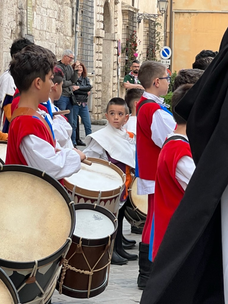 Each of the town’s four neighborhood created a program of traditional events and religious celebrations, and fielded a troupe of young drummers and flag tossers, dressed in medieval garb.