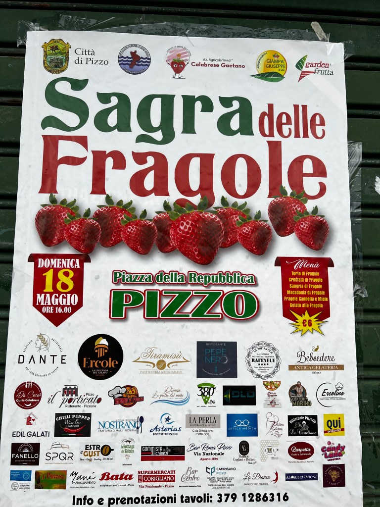 We are big fans of Italian sagre, local festivals sponsored by towns or parishes to celebrate a feast day or a local specialty. They are often out in the countryside and challenging to find, so we were delighted to see that the town of Pizzo, about a half-hour away from where we were staying in Calabria, was sponsoring a one-day Sagra delle Fragole, strawberry festival, on a date that would work for us. Perfetto! Let’s do it!