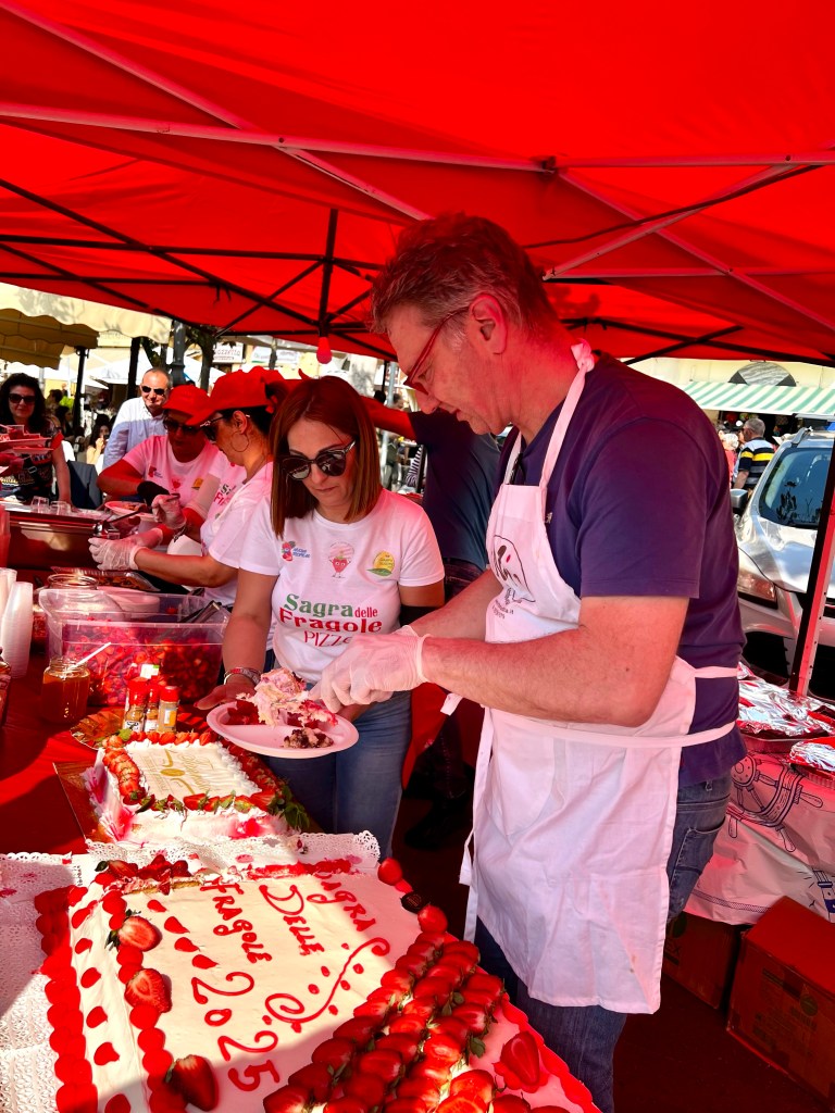And the Sagra delle Fragole did not disappoint. Its two main features, a stand selling platters of four different strawberry desserts and a stand selling fresh berries, were extremely popular, with scores of people patiently lining up awaiting their turn to buy.